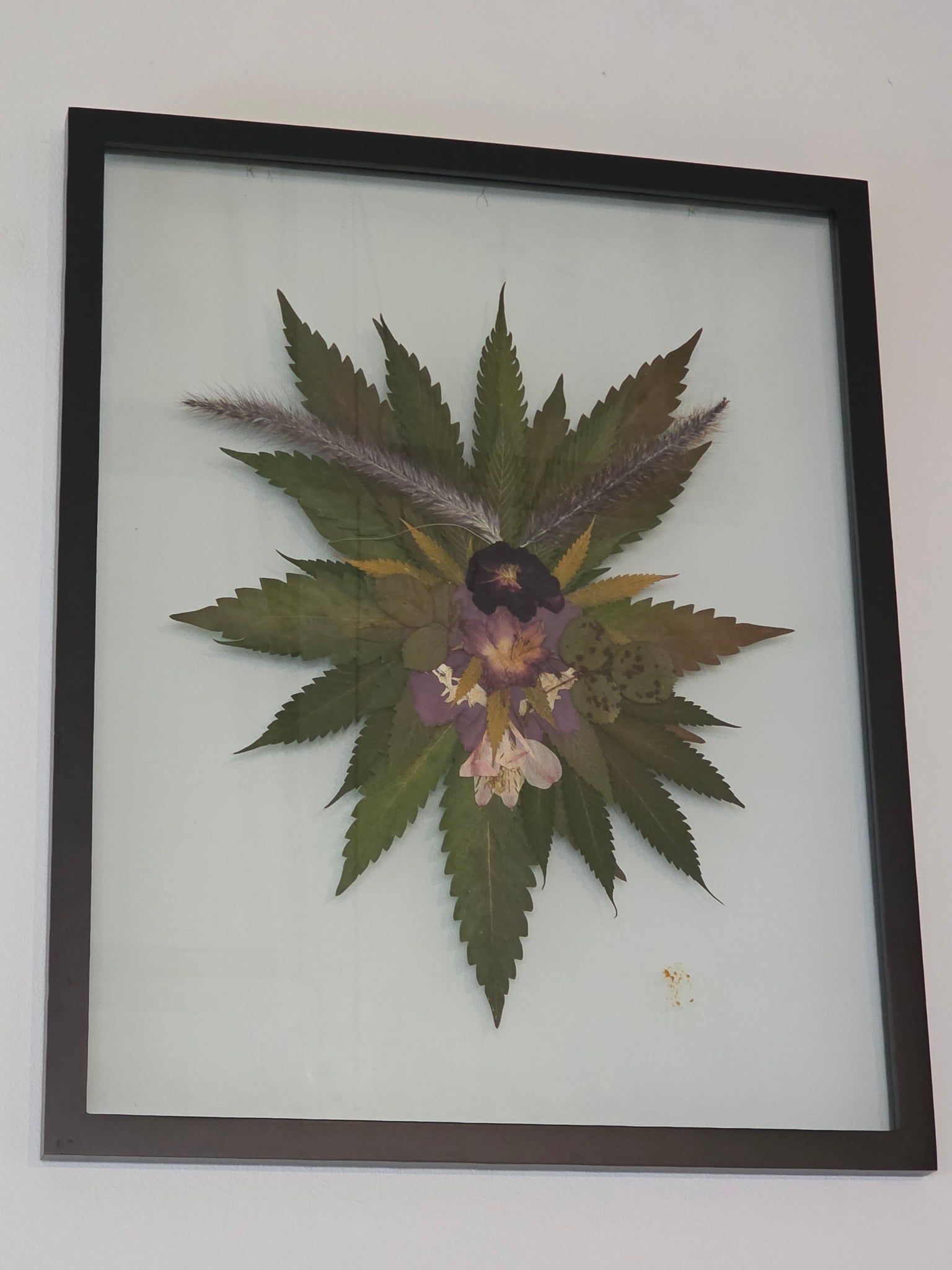 Dried, pressed foliage in glass frame.